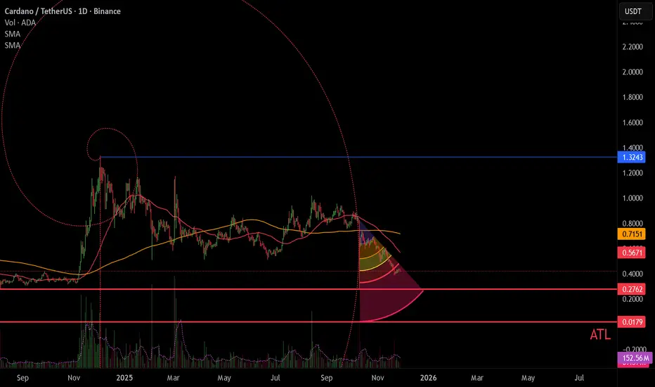 The long-term SMA around $0.71 is now a ceiling of doom — a structural reminder of how far ADA has fallen and how far buyers have abandoned the asset.