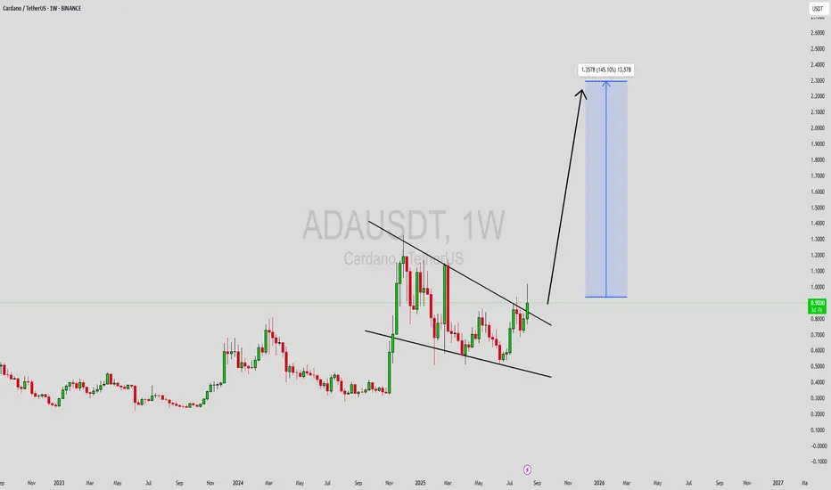 ADAUSDT is showing a strong bullish setup as it trades within a falling wedge pattern, a well-known technical formation that often signals a potential trend reversal to the upside. The price action has been steadily compressing, with lower highs and lower lows converging toward a breakout point. The presence of good trading volume indicates healthy market participation, adding weight to the possibility of a significant rally once resistance is breached. With an expected gain potential of 90% to 100%+, ADA could be preparing for a powerful upward move.