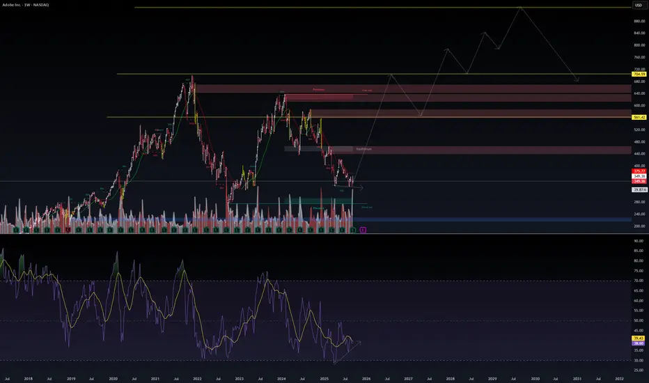 Adobe sits at a critical accumulation level. If support holds, earnings strength + AI adoption momentum could propel price toward $550–$700. A failure to hold $330–$360 support would shift bias bearish toward $300.