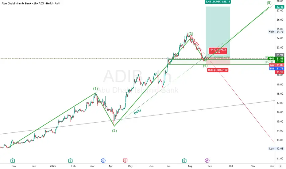 ADIB is showing textbook Elliott Wave behavior. After a strong impulsive wave structure into wave (3), price corrected cleanly into the **Demand Zone** and held above the key support at **21.16** – right in line with a classic wave (4) retracement.
