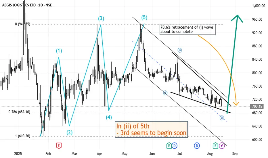 The script is doing 5th of weekly time-frame and seems to about to complete (i) of 5th with 78.6% retracement. The (i) was a diagonal impulse wave. And now in retracement, the C wave also appears to be forming an ending diagonal. After this is completed, (iii) wave should start.
