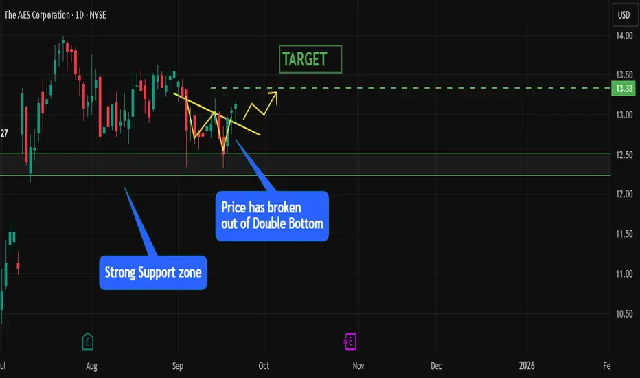 Overall, the technical confluence of a Double Bottom breakout, strong support zone confirmation, and a clear price target of 13.33 makes AES an attractive setup to watch in the coming sessions.