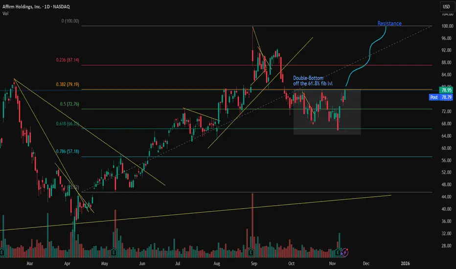 Let's keep this simple!! AFRM just formed a beautiful double-bottom, testing support at the 61.8% fib retracement level and bouncing nicely from it. It doesn't get better than this, and it will be testing resistance at the $100 price level sooner rather than later.