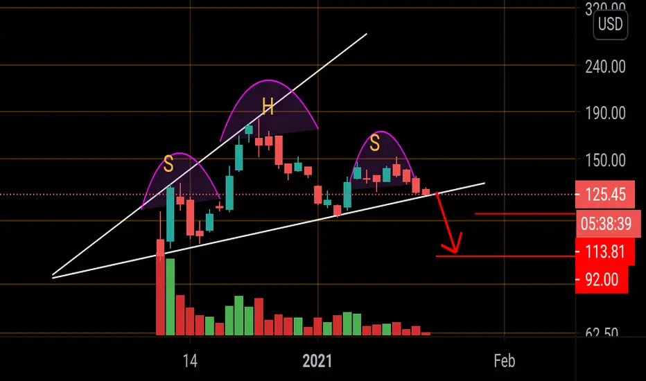 needs to hold bottom of the channel.. if it falls through the first target would be 113 which coincides with the double top forming in the right shoulder. second target is 92$ which would fulfill the H&S..