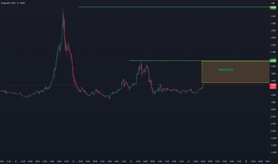 DeAgentAI (AIA) is showing renewed strength after a long consolidation phase, with price now building momentum toward the $1.50–$1.60 zone. The chart highlights a volume box area between $1.50–$2.15, which often acts as a liquidity build-up zone before a strong breakout move.