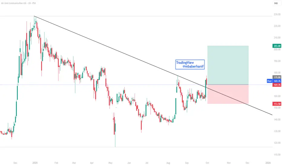 AIRLINK has successfully broken above its long-standing descending trendline, signaling a shift in momentum. The breakout indicates bullish strength, supported by higher volumes and sustained buying pressure. A retest of the breakout zone is underway, which, if held, would further confirm the continuation of the upward move. Based on the current structure, the first target is placed at 188, while the second target is projected at 203. On the downside, the invalidation level for this view lies below 153.50. Sustained movement above the breakout point will keep the outlook positive in the coming sessions.