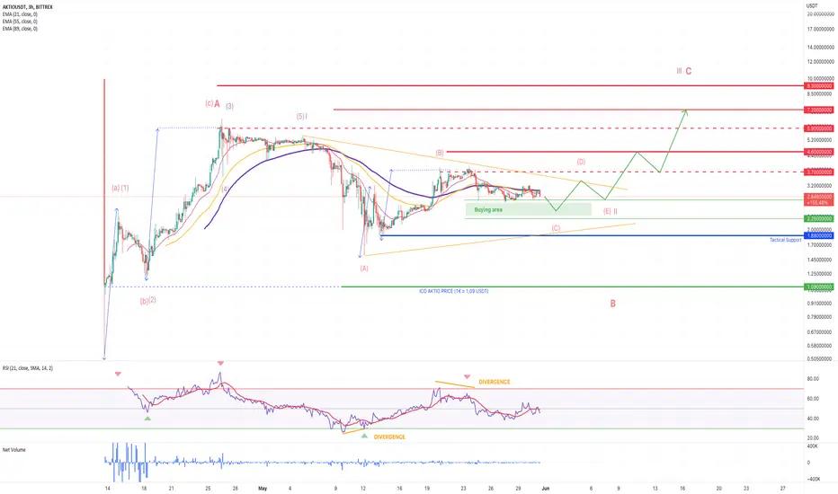 Prefered case => The AKTIO COIN is expecting to evolve in a ''Triangle'' trading range which correspond to a consolidation within a global crypto market in a bearish mode. As long as 1,88 remains support, the buying area is offering opportunity to enter in the range in order to anticipate a bullish exit towards 4,60 and 7,20