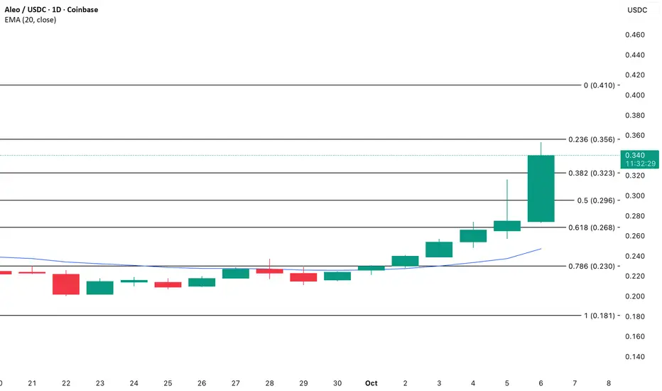 ALEO is currently trading at $0.34, holding firm above its 20-day EMA, which acts as dynamic support around $0.23. This moving average reflects short-term momentum and gives greater weight to recent price action—trading above it often signals strong bullish sentiment.