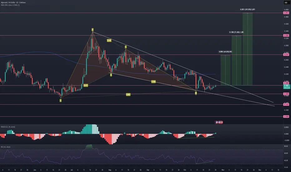 Algo is showing a potential Gartley/Bat Bullish Harmonic Pattern at a key level (18.9 cents, which was a swing low in September 2019. There is also some Classic Bullish Divergence on the MacD on the daily time frame. Some on the RSI as well. Price has also been contained within a nice falling wedge structure locally. Let's see what happens. Easy to strategize an entry, stop loss, and take profit levels here where you can take on minimal losses if it fails. kangs.