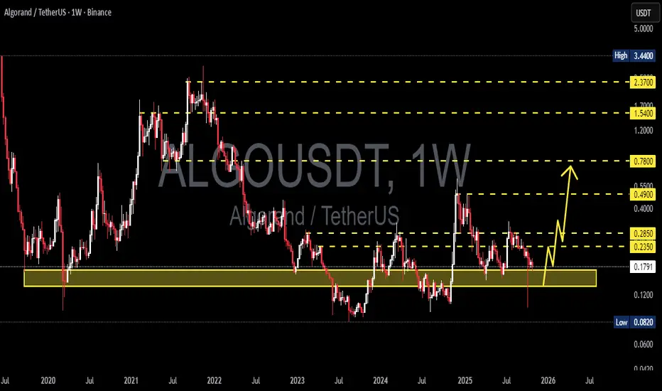 ALGO is now trading at one of the most decisive zones in recent years, a major historical support area between 0.17–0.135 — a battle zone between buyers and sellers since 2020.