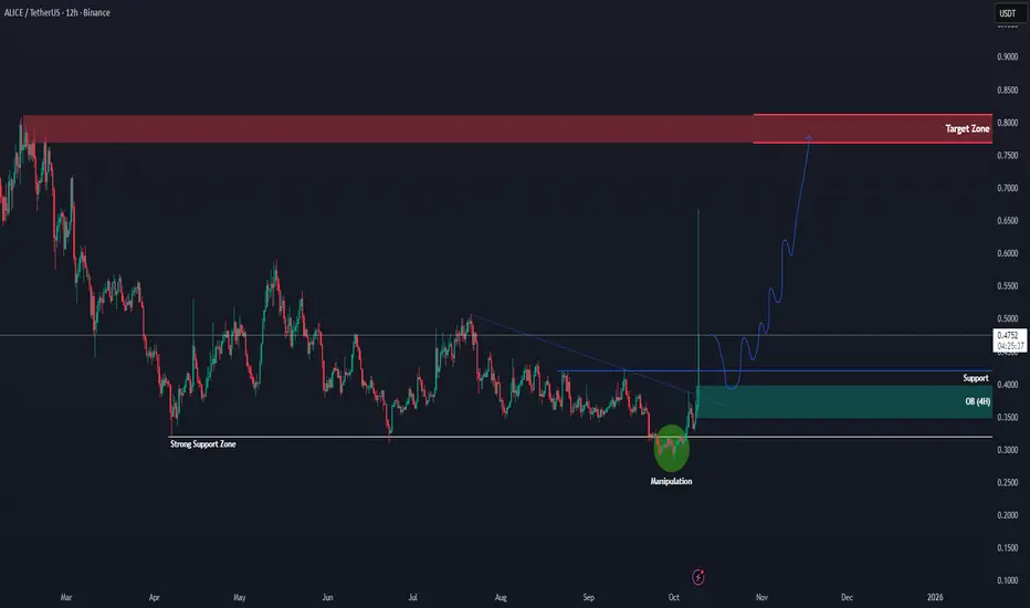The next major target sits around the 0.75–0.80 region, which aligns with the previous major resistance zone and liquidity area. However, if the price breaks back below 0.35, it would invalidate the current bullish setup and open a possibility for a deeper retracement. For now, ALICE is showing promising momentum, and the structure supports a potential mid-term bullish rally.