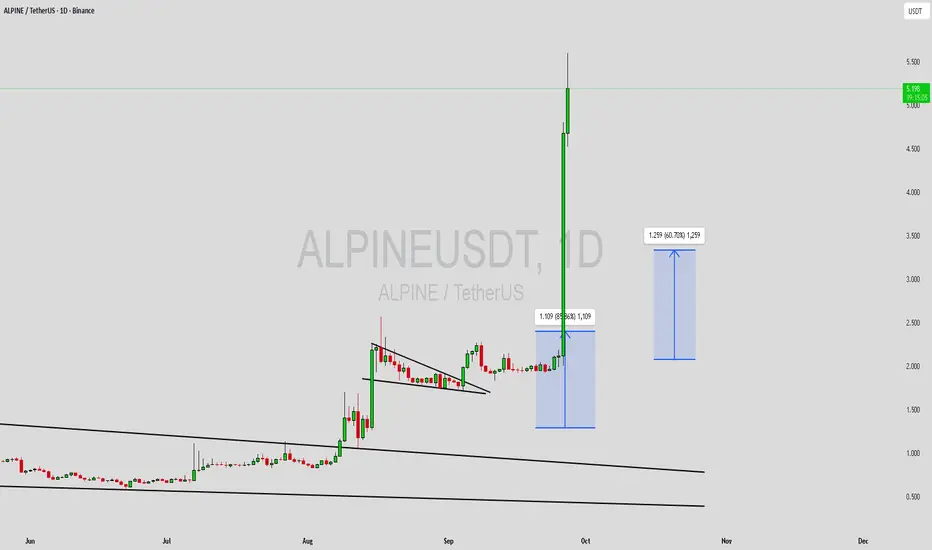 ALPINEUSDT is displaying a bullish wave pattern that signals strength and momentum in the market. The setup indicates that buyers are stepping in consistently, supported by solid trading volume. With this positive structure, ALPINEUSDT is showing potential for a 50% to 60%+ gain, making it an attractive opportunity for traders watching for breakout plays in the altcoin market.