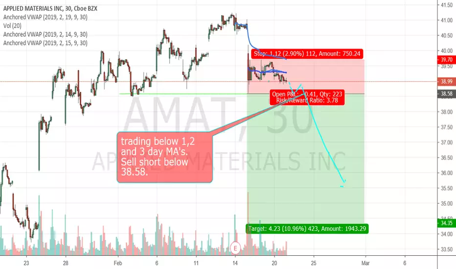 AMAT trading below 1,2 and 3 day MA's. Sell short below 38.58.