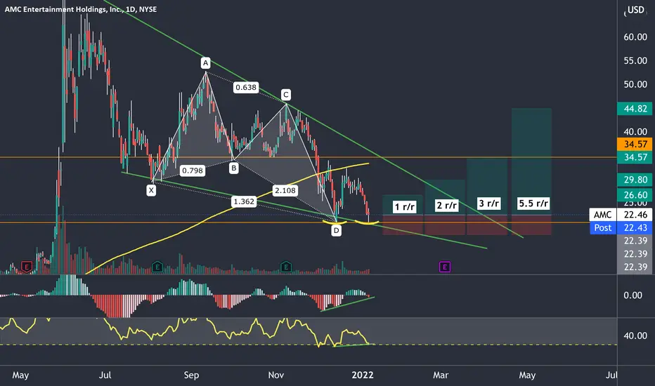 MID-TERM: Double bottom around the PCZ of a butterfly, falling wedge, potential classic bullish divergence, 20% short interest. (not financial advice)