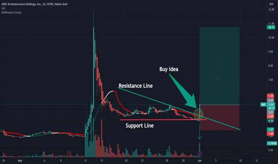 Buy idea on AMC as you see on the chart after the breakout with force the vwap and the resistance line by a big green candle follow by a large green volume.!