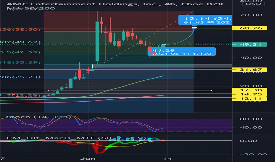 Hey guys so I made a quick TA on AMC and I think we are definitely going to $60 very soon I mean look the Reversal MACD just bullish crossed, STOCH made a bullish cross, price got rejected on 0.5 FIB support, MA 50 above MA 200. There is a nice confluence here, I usually prefer some more confluence but I believe that just fine.