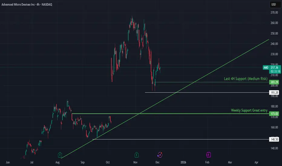 AMD is attempting to stabilize after a strong corrective move from its recent highs. Price has formed a short-term rebound, but remains below local resistance levels. The chart shows two major support structures: a 4H support at $203.29 and a deeper weekly support at $173.02, which stands out as the highest-value entry zone. As long as the broader uptrend structure holds, AMD retains a constructive bias.
