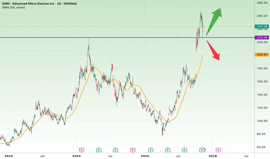 AMD is at a decisive support level. If buyers defend the $230 zone, a new rally could form; otherwise, a deeper pullback is likely before the next leg up.