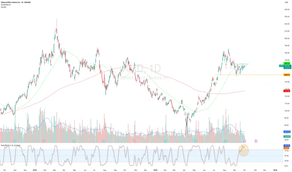 I’m looking at AMD and I don’t like what I see. The stock is stuck under this $165–170 resistance, and every time it gets up there, sellers push it back down. The chart is forming what we call a “rising wedge” — that’s usually bearish because it shows price climbing on weaker and weaker momentum. Even the volume is fading, which tells me buyers aren’t really committed up here.