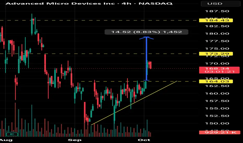 Amd has bottomed at 150 and started trading in a ascending triangle with a 164 resistance.