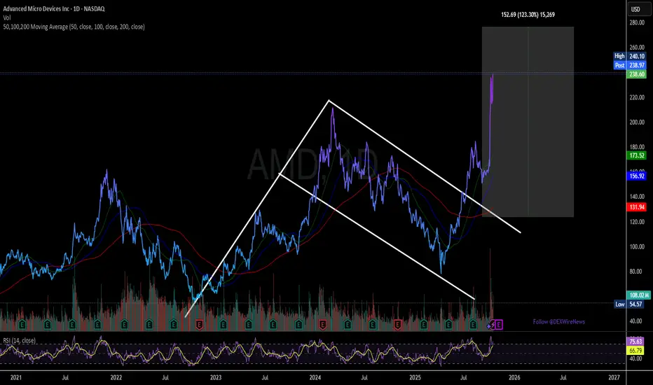 The price of Advanced Micro Devices, Inc. (NASDAQ: AMD) has broken out of a falling wedge pattern gaining roughly 9% today. With the daily price chart showing a golden cross pattern the stock is poised to reach the $270 pivot and beyond amidst growing interest.