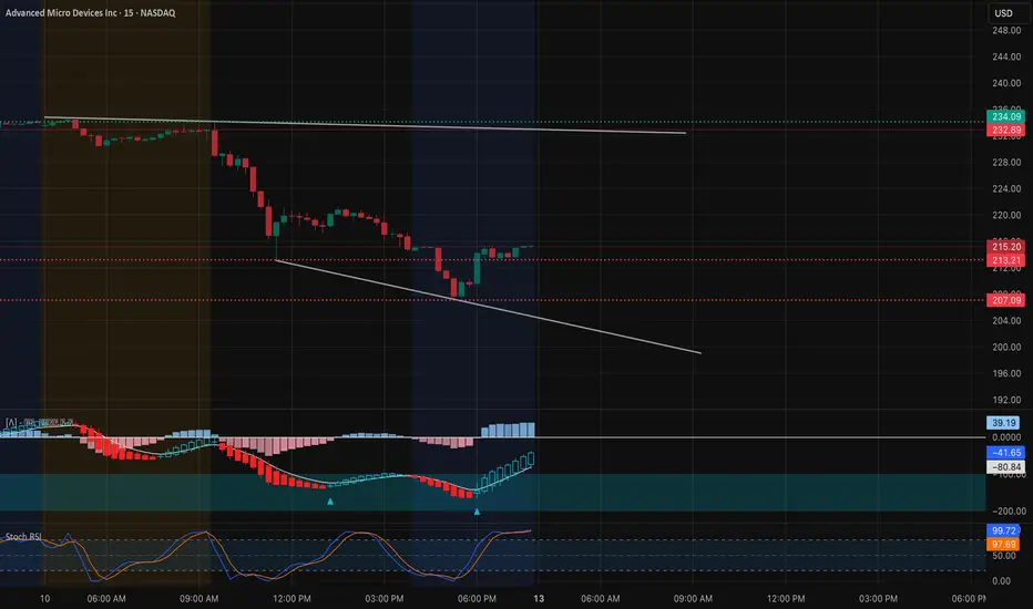 The 15-minute chart shows a clear downtrend channel, with AMD printing a series of lower highs and lower lows since the breakdown from the 232–234 resistance zone. The most recent candle sequence suggests the sell momentum is finally slowing down — notice how the last few candles consolidated above 213, forming a short-term base.