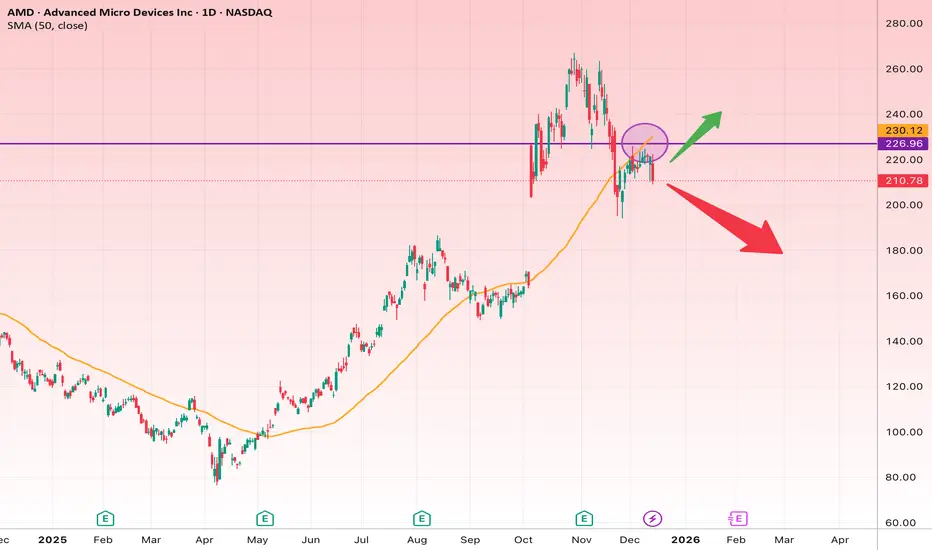 After a strong bullish impulse, AMD has entered a corrective phase and is currently trading below the 50-day SMA (around 230) and under a key horizontal resistance zone at 226–230.