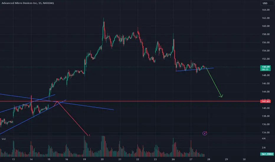 Having said that, if AMD breaks this little uptrend/bear flag it has been in since Monday, I think it could see a lot more weakness after, first target being the gap fill below around 141.
