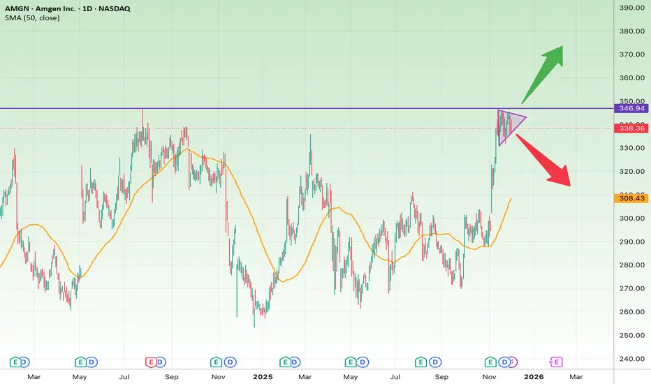 AMGN has formed a bullish pennant pattern after a strong upside rally. This compression typically acts as a continuation setup, suggesting that buyers are preparing for another push higher—if the major resistance gives way.