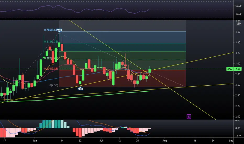 With a float of only 3,25M AMS is setting up for a parabolic spike. Price opened with a slight gap up to close above the .23 fib level and above the trend line on the daily. It also managed to break out of its wedge on the weekly. In addition the RSI is still low and the MACD is crossing.