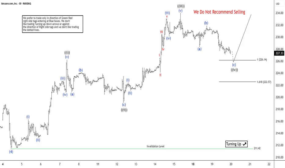 Amazon (AMZN) continues its cycle from the August 2025 low, unfolding as a five-wave impulse in the Elliott Wave framework. From that low, wave (i) peaked at $216.30, followed by a shallow pullback in wave (ii) to $213.25. The stock then surged in wave (iii) to $222.75, with a brief dip in wave (iv) concluding at $220.71. The final leg, wave (v), reached $226.22, completing wave ((i)) in a higher degree. A correction in wave ((ii)) followed, bottoming at $219.05.