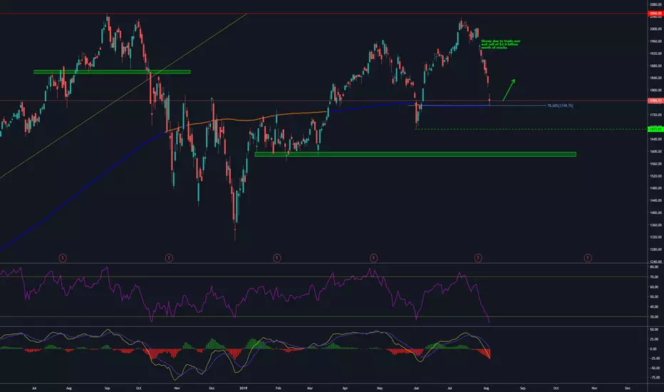 Last week saw a slump in Amazon share as $2.9b worth of stocks were sold, some by Bezos himself to fund his rocket company 'Blue Origin'. Also, trade war caused a panic in the markets. Now at 200SMA daily and 78.2% retracement. Good opportunity to buy with great risk reward, if this level holds.