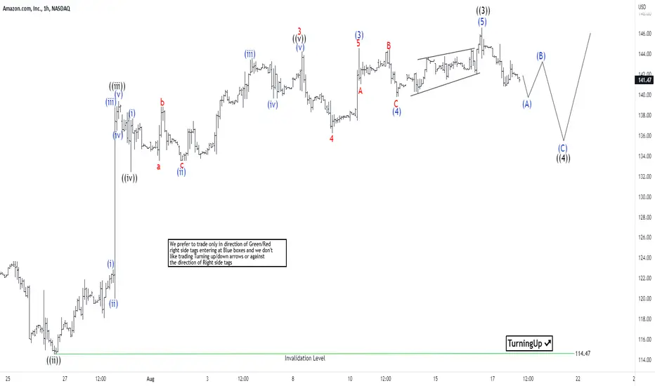AMZN) suggests the rally from 5.24.2022 low is unfolding as a 5 waves impulse Elliott Wave structure. Up from 5.24.2022 low, wave ((1)) ended at 128.99 and pullback in wave ((2)) ended at 101.43. The stock has resumed higher in wave ((3)) with internal subdivision as an impulse in lesser degree. Up from wave ((2)), wave (1) ended at 118.09 and dips in wave (2) ended at 102.52.