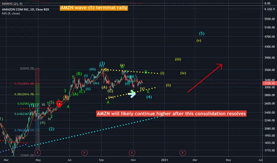AMZN running triangle almost complete with a pullback into 2990-2980 acting as a good level to establish longs for a potential wave (5) rally that could carry us into 3,900-4,000. Exact trade details in video update, looking to establish Leaps/Bullish Verticals into 2021 for AMZN.