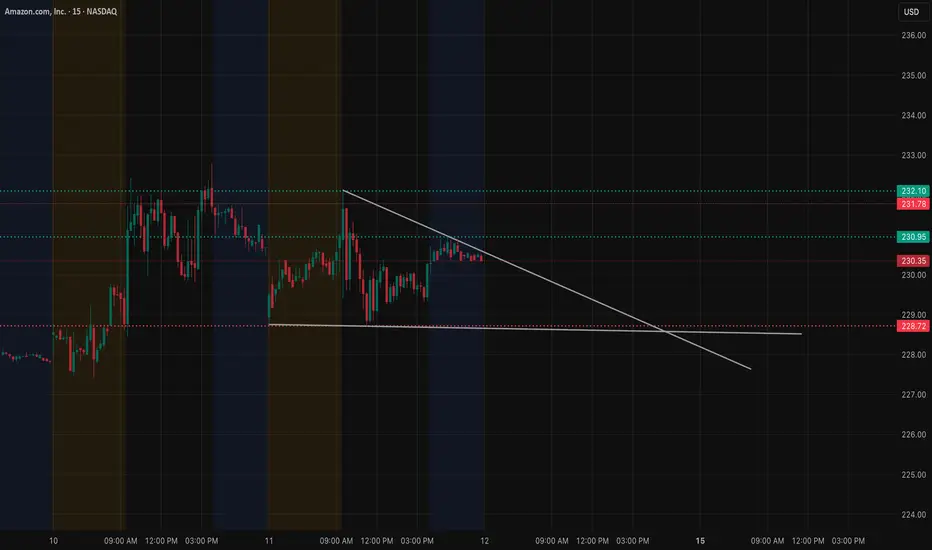 AMZN has been trading in a contracting structure on the 15-minute timeframe, respecting a downward trendline that has repeatedly rejected price. Each attempt to push through the 230.50–231 zone has been met with selling, keeping AMZN stuck under this tightening resistance. The price action has formed a clean triangle compression: lower highs from the trendline and a flat demand shelf around 228.50–229.