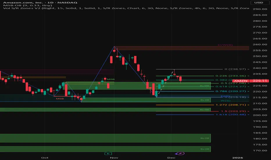 0.618 "Golden Pocket" (224.27): This is the most critical immediate support. It aligns perfectly with the green Bullish Order Block (Bu-OB).