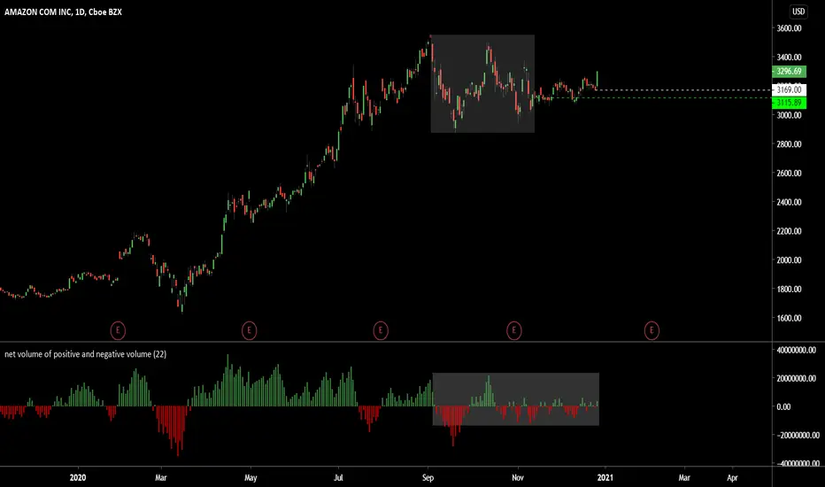 The range trade from November 13 has been like watching paint dry until today. You can see the overall decrease in the net volume amplitudes- a sign of little movement in either direction. With todays big move we now sit a little above the mid point of the range but where is amzn heading next? As long as the broader market uptrend remains intact amzn could be heading back toward all time highs. The reference point to watch is Fridays low 3169. If that holds the trade is still on and the highs of the range is our initial target