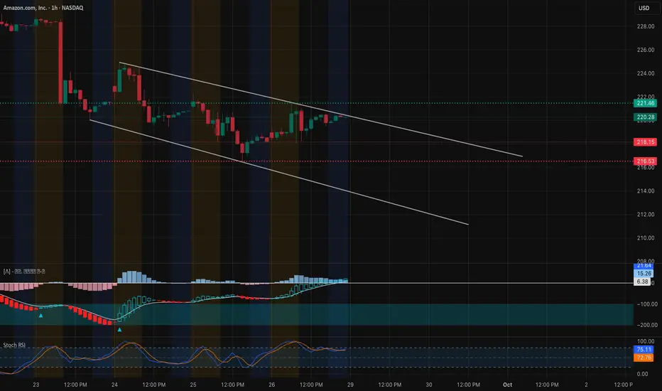 Amazon is still moving inside a descending channel that’s been intact for over a week. Price has been repeatedly testing the $217.5–$218 support while carving out slightly higher lows—early signs of a basing attempt. Current price near $220 is rubbing against the channel’s downtrend line. MACD histogram is building positively and Stoch RSI is holding in bullish territory, hinting at upside momentum if buyers press through resistance.