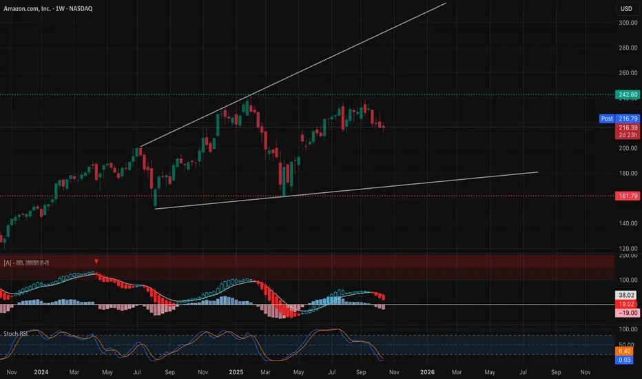 Amazon’s weekly chart reveals a consolidation at the top of a long-term ascending channel, with clear exhaustion signs showing after months of strong accumulation. The structure printed a CHoCH (Change of Character) below the $242 resistance zone, signaling that sellers are regaining control short-term.