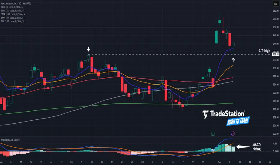 Last, AMZN is an active underlier in the options market. (Its average daily volume of 977,000 contracts ranked fourth in the S&P 500 last month, according to TradeStation data.) That could help traders take positions with calls and puts.