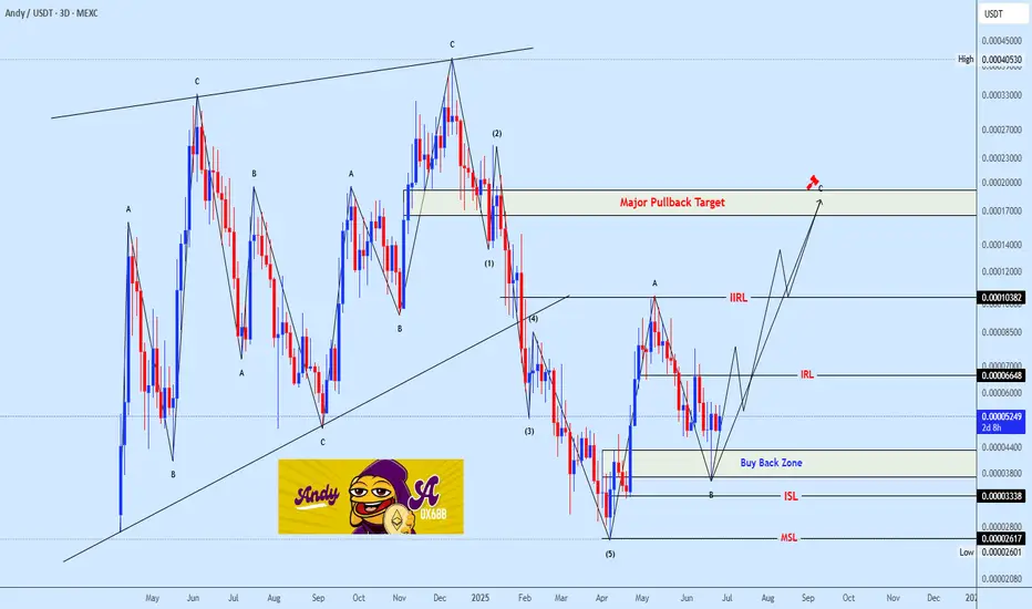 ANDYETHUSDT broke down from its rising wedge, reaching a key support zone around 0.00002617. Price has since entered an extended ABC correction, with wave A completed and a potential impulsive move forming.