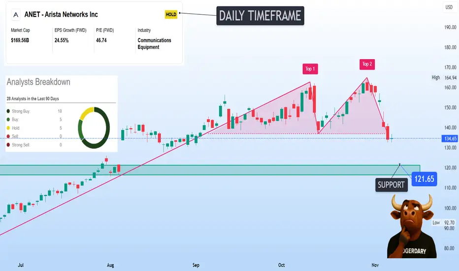ANET is forming a clear double-top pattern on the daily chart, signaling a potential short-term trend reversal after a strong uptrend.