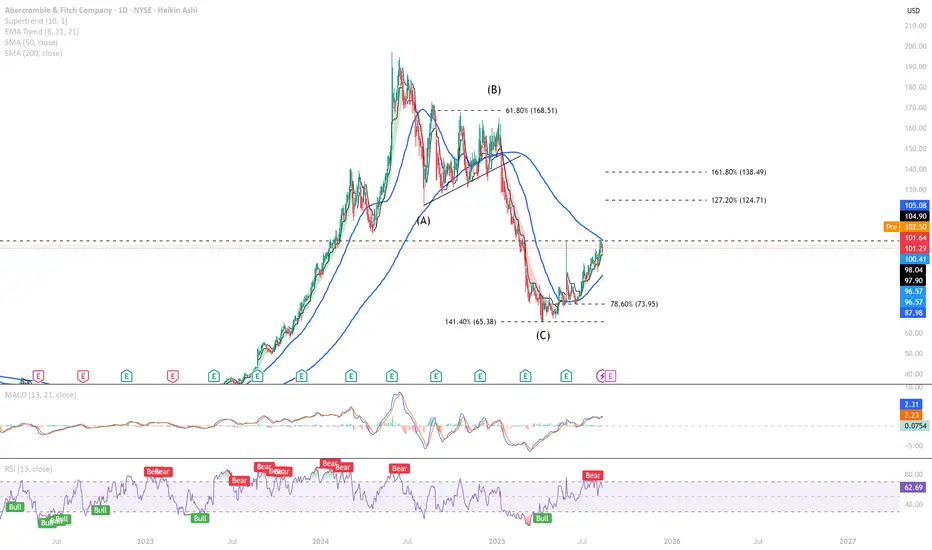 Abercrombie & Fitch Fierce has experienced a sharp downtrend for the past year, characterized by A-B-C impulsive corrective waves.