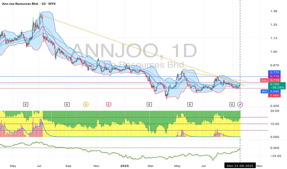 From the chart we can see the pattern is downtrend and trying to change trend to uptrend but must have enough volume and momentum to change uptrend.BO:0.715,SL:0.66,TP:0.77