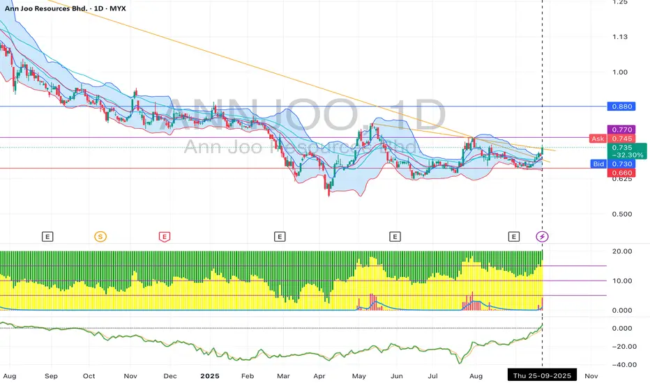 From the chart we can see that it is starting to BDTL based on all the indicator that I use, it seems that it is starting to climb up changing the trend to uptrend.Fromthe indicator of RSI it seems that the movement of the EMA is starting to uptrend,while the indicator of smart money is currently incoming.The Bollinger Band as we can see,the uppercloud is starting to hit by the candle stick and te lower cloud is starting to move downward because of the volume has increase,EMA 8,21,55 is starting to move uptrend and it is below the candle stick.Which means it is starting to move uptrend based on all indicator that Ive stated.BO:0.77,SL:0.66,TP:0.88