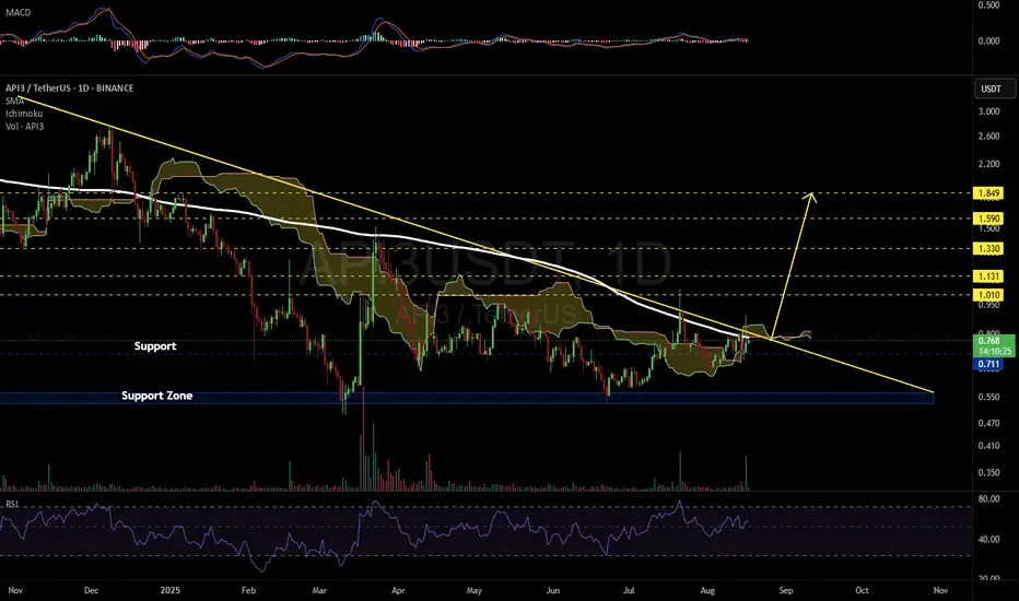 #API3 is moving inside a descending triangle on the daily chart. Consider buying some #API3 at the current price and near the support level of $0.711. In case of a breakout above the resistance cluster — which includes the triangle resistance, the daily SMA200, and the Ichimoku cloud — the potential targets are: