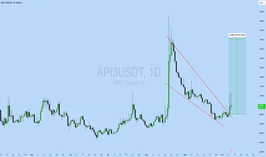 $API3 is breaking out of a falling wedge pattern on the 1D timeframe. Current price is $0.887 with a target near $1.69, showing about 100% potential upside. The breakout indicates renewed bullish strength and suggests potential continuation if momentum sustains. Always use proper risk management.