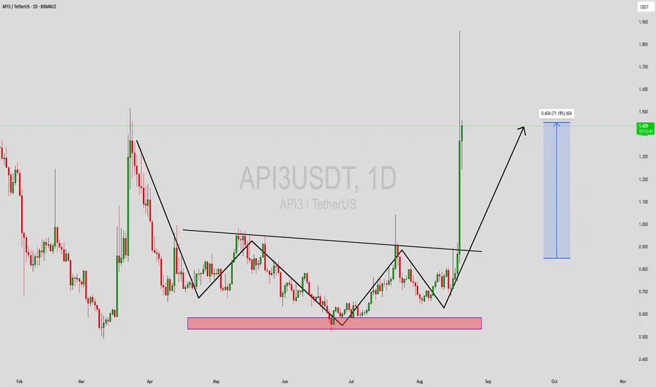 API3USDT has recently broken out of a long-term consolidation range, signaling a strong bullish shift in momentum. The chart clearly shows a breakout from a rounded bottom formation combined with a horizontal resistance level, which has now turned into a strong support zone. This technical structure often leads to sustained bullish rallies, and the volume spike during the breakout further confirms institutional and retail interest converging on this move.