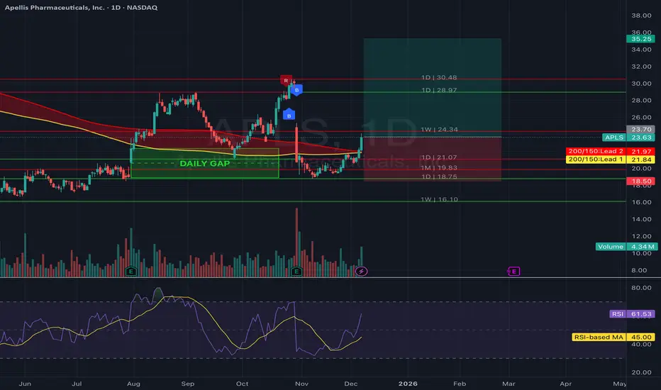 Apellis Pharmaceuticals is currently testing the bottom of a key weekly gap near the $20 level, an area that has historically acted as a strong support zone. A confirmed breakout above the $29 level would signal renewed bullish momentum and open the path toward the $35.25 resistance, which aligns with prior supply and structural resistance.