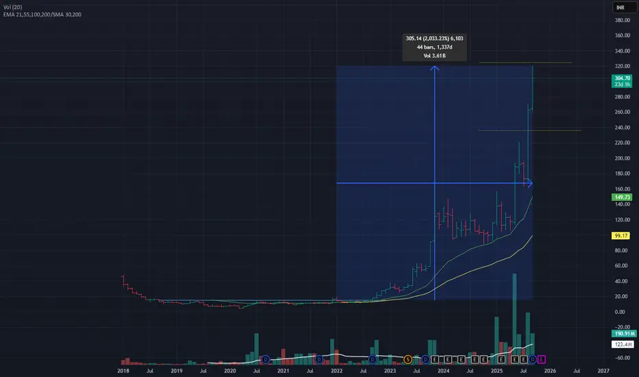 Sometimes we stumble upon stocks without fully recognizing their true potential. When I first identified this script through my screener on January 4th, 2022, it was a small-cap company showing signs of a multi-year breakout and positioned as a proxy player in the defense sector. I projected a 2–3X return based on its technical setup and thematic relevance. Fast forward to today, it's grown into a ₹10,000 crore market cap company. At this stage, I don't expect explosive price action; rather, it may offer steady compounded returns post a significant correction. The recent surge in social media hype feels more like strategic offloading by whales.